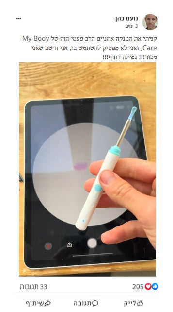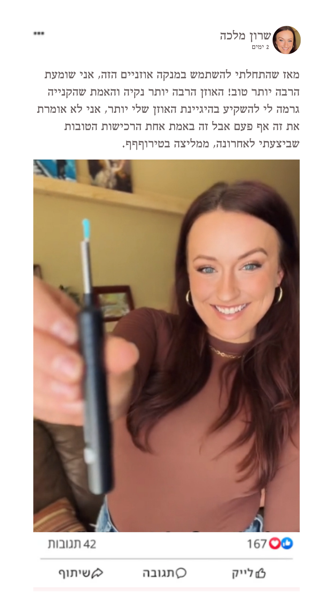 סיימת את השלבים לחיבור המלצמה, מעכשיו ניקוי האוזן יהיה מהנה ובטוחה יותר והשמיעה רק תשתפר.